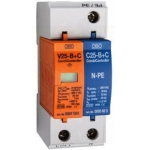 OBO V25-B+C1+NPE : Chống sét 2P In 60kA, N-PE chống xung sét 10/350us, xung lan truyền 8/20us, trên đường truyền